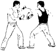 ① 甲方左前右后不不八步站立昭阳手右半掩身。乙方左脚在前右脚在后用左掌1外上方向内下直臂斜下劈用左手刀打击甲方的右倒颈部。(图931)