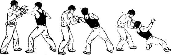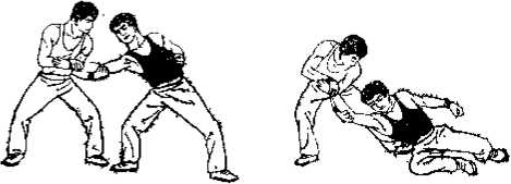 向右后下方拉身躯从左而右转成左前一僚身把乙方的右手臂外旋反扭使之失去平衡而倒地。(图9334)
