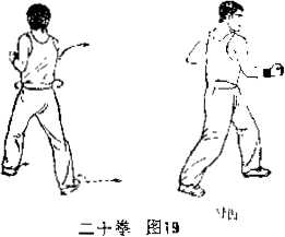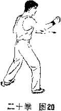 接上式左脚以足跟为轴内扣足尖向右前方身躯右转向北成墓牌身。同时有足随身右转向北(左门)跨出一步膝略屈成右不不八叽,右掀桥的动作与第二动相同。(图20)