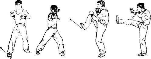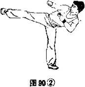 ② 伸膝直腿用右足掌向内上前方斜向击出高不过腰(图86也)
