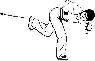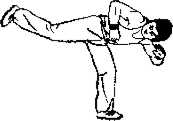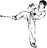 ② 伸膝直腿用右足跟向后上方蹬出位高平腹足跟向后身躯前倾并略右转。(图912)
