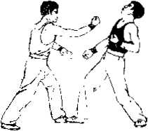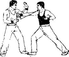 ① 甲方左前右后自然站立左行礼式一僚身方右脚在前左脚在后用右拳向前直臂撞出打击甲方的胸部。(佟81)