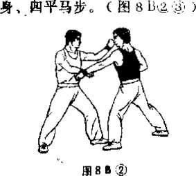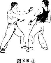 ③ 甲方左前右后成不,不八步站立左垂手式右半掩身。乙方左脚在前一右脚在后用左拳向谕直曾撞出打击甲方的胸部。(图8))