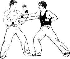 ① 甲方左前右后1-1然站立左行礼式-僚呀。乙力右脚在前,左脚在后用右举向前引曾撞出打击甲方的胸部(图91)