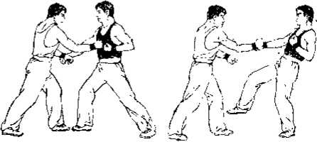 ③ 在图92中若甲方的右拳被乙方的左手封住,甲方应顺势放下右拳迅速上右步向乙方双脚中间踏进踏中宫)继续左转身成一僚身用右肩撞向乙方的身躯。因为此时对方已近身用右肩逼出撞击不但可以阻止乙方左拳的进击,同时可以把乙方撞出或撞倒