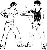 ④ 乙方用右手向压住甲方的左拳,与此同时甲方的右竖拳继之撞出打击乙方的下颔并用左拳外旋带开乙方的布压