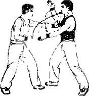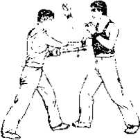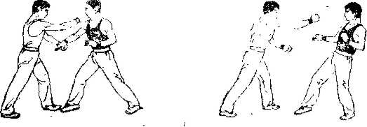 ① 乙方右脚在前左脚在后双垂手式左半掩身甲方左前右后用左竖拳向前撞出打击乙方的胸部。(图18匕