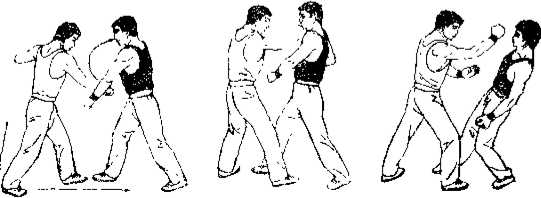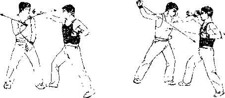 ⑤ 在图193中甲方继续左转身与右斜扫拳应紧接左横扫拳之后连续不停地进击否则这种大距离、长时间的出击易为对方招架或避过=若右斜扫拳被乙方的左手封架住甲方可迅速右转身用左钩拳由下而上出击击向乙方的胸部或下颔。