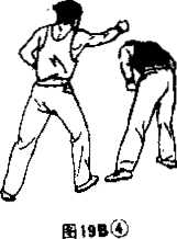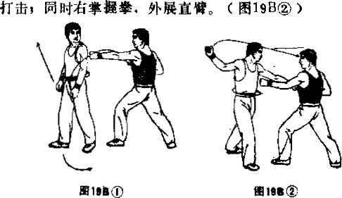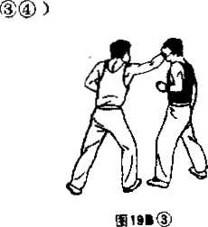 ② 在图19一土2中当甲方用左横扫拳扫开乙方的右拳时中门大开易遭攻击因此左转身要快。这样不但可以缩小被打击面或避开打击而且还可以加大右斜扫拳的速度和力量。