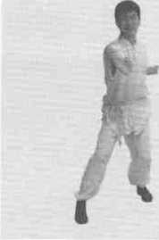 左脚向前跟步与右脚相交叉成叠步右拳变掌向右前方扣击左掌向左下方扣击眼觇右手。(图5-19)