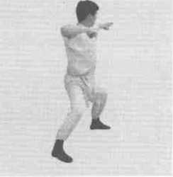 右脚向前落步成三战马步同时右掌变拳向前挣(图5-18)