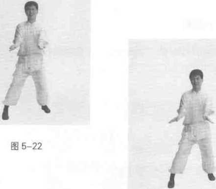 右脚向前进步成右三战马步左掌变拳收于腰间右掌向前削出-(图5-21)图5-21和夕林五擅术24. 转身双摇右脚向前一步同时身体后转成三战马步两手由下向前摇掌。(图5-22)25. 退步双扣掌右脚向后退半步左脚跟着后退成右三战马步双掌向下、向两侧扣掌(图5-23)图5-2326,右弹腿右脚向前弹腿与腰同高力达脚尖眼视前方(图5-24)70