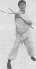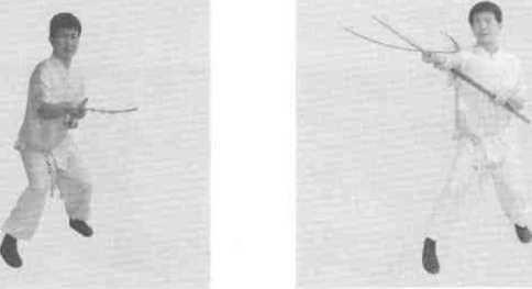 35. 上动不停。左、右脚再向前跳步并前刺叉°(图7-63、图7-64)