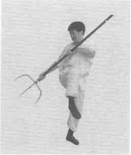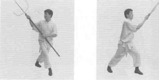 3提左脚绕叉把端一圈后落步成右弓步〈叉把端向左侧下砸。(图7-67)