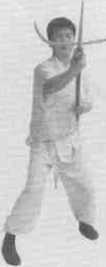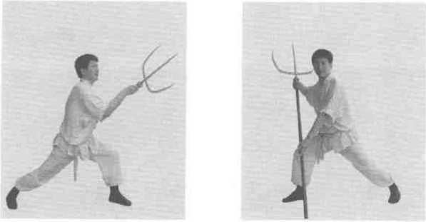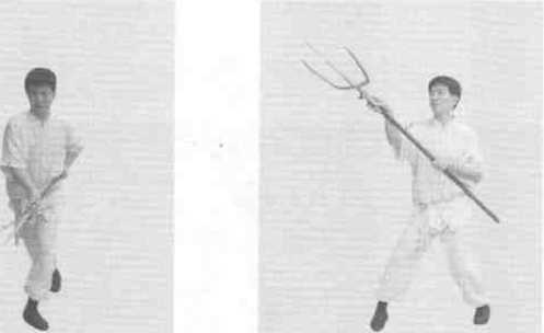 41. 右脚向前上步刺叉成右三战马步 (图7-70)