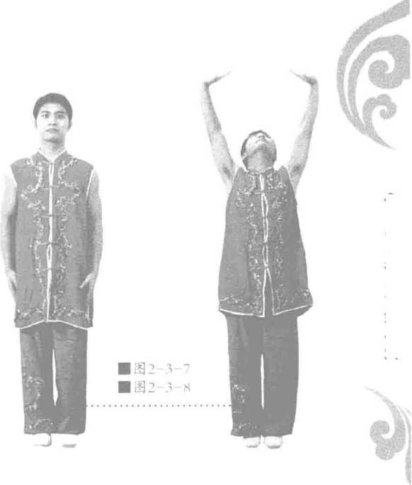 身体保持正直身形挺拔百会上顶有拉长之感全身经脉开展拉长两膝挺直。两手向上托于头顶掌心向上十指相对眼看上方。意念双掌托住一块压向自己的巨石配合呼吸双掌上托呼气时双掌用力上推,吸气时,推劲不放松,气贯掌心劳宫穴,七七四十九次呼吸即可见图2-3-7、图2-3-8