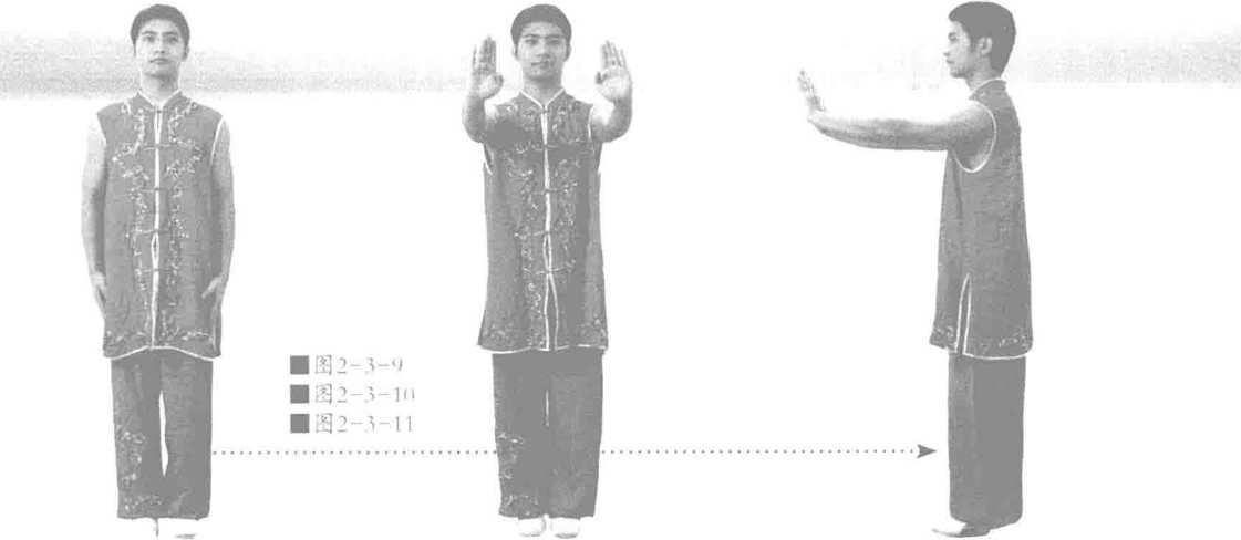 两膝挺直。两手分开与肩同高向前推出十指尖向上。意念双掌推开压向自己的巨石配合呼吸双掌前推呼气时双掌用力前推吸气时保持推劲不放松气贯掌心劳宫穴。七七四十九次呼吸即可见图2-3-9?图2-3-11。