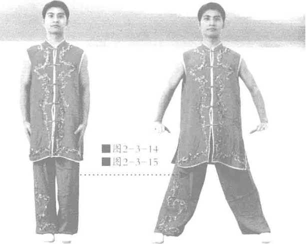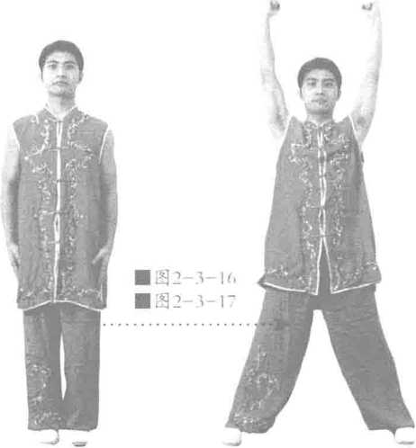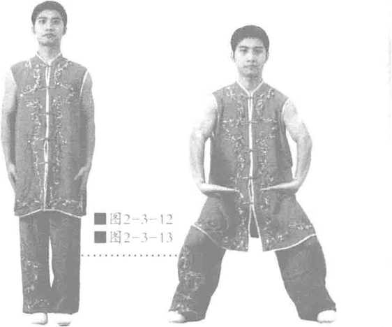 身体保持正直身形挺拔百会上顶有拉长之感全身经脉开展拉长两膝挺直。双掌置于身体两侧掌心向下指尖向前方。配合呼吸双掌下按呼气时双掌用力下按吸气时保持用力不放松,如此七七四十九次呼吸即可见图2-3-14图2-3—15。