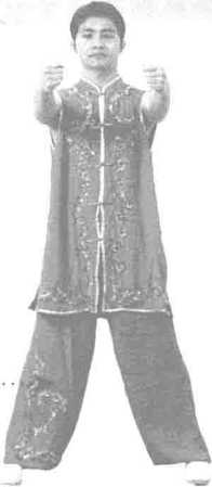 两脚分开略比肩宽身体保持正直身形挺拔百会上顶有拉长之感全身经脉开展拉长两膝挺直。双手握拳向前伸出拳心相对脚趾抓地咬牙配合握紧双拳呼气时用力握拳吸气时拳头握紧
