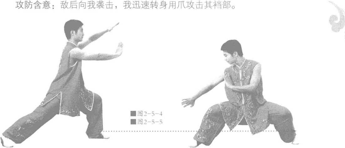接上式右腿后撤一步同时右拳变掌由上向下向后方敌人的裆部