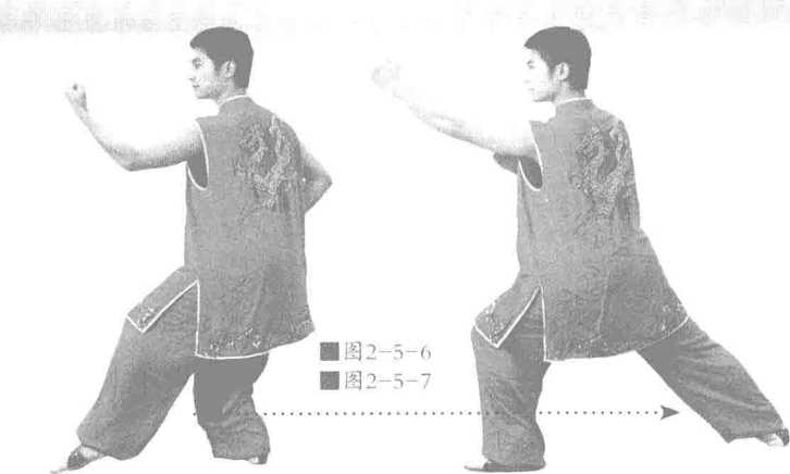 迈一弓步同时出右拳见图2-5-2、图2-5-3。
