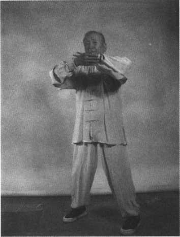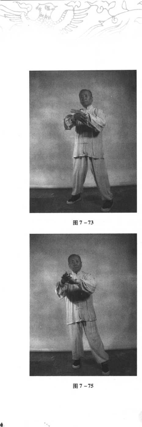 接上式揽雀尾,挤式是面向正西的,挤出以后身体要向左转动,转动前眼先 向左看。接着右脚内扣,左腿向前微伸,面向正南(见图7 -75),同时两手臂向 下向左平云,画圆弧收回至胸前,回收时左掌心渐渐翻转向上,右掌掌心向下, 两掌微微相合。眼神转向右平视,左手轻托右手向西北平送,右臂向右平伸,五 指撮拢,指尖朝下变勾,高与肩平(见图7-76)。左手仍置胸前,掌心向内。提 左膝,向左转腰,眼神向左平视,左脚向左前迈出一大步,脚尖向东南,右脚随左 脚内扣45度,至面向东南,斜单鞭,足跟着地,脚尖翘起,内劲催左臂向左平贴, 重心慢慢移至前脚,左手心翻转向下,内劲引领向下沉採,同时重心移至后腿。 不停止地重心再向前移动至前腿,内劲引领左掌心向前按出(见图7-77)。