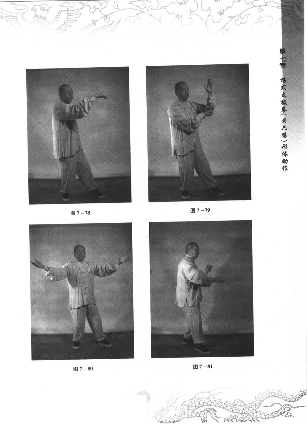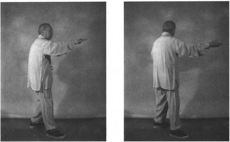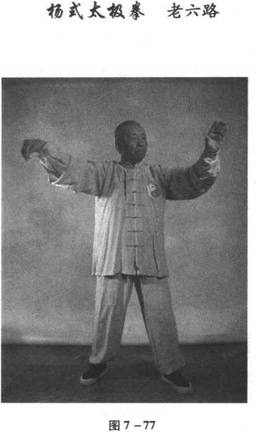 身体右转,左脚掌点地,左掌向前微伸;右拳变掌自左肘下,画弧撤至右跨 旁,随撤随着臂外旋使掌心渐渐翻转向上。重心渐渐移于右腿,左腿经右踩内 侧提起;身体继续向右微转;同时,右掌向后偏右弧形举至与肩平,左臂外旋使 掌心朝上;眼神观注右掌后举(见图7 - 80、图7 - 81)。