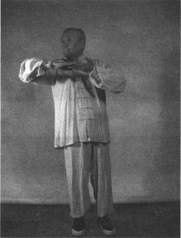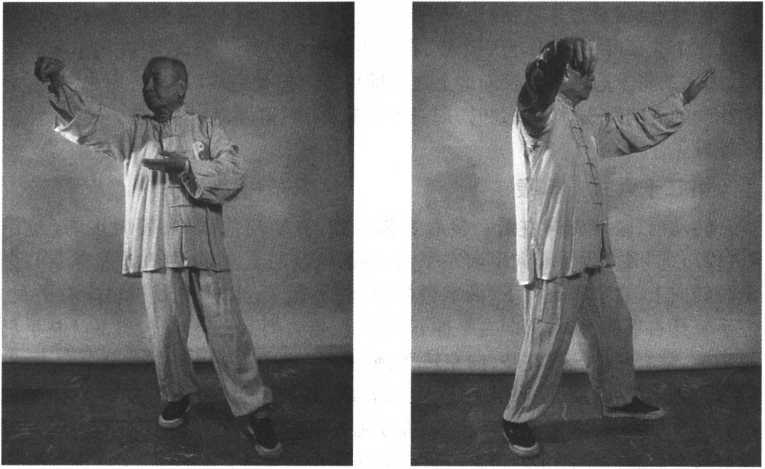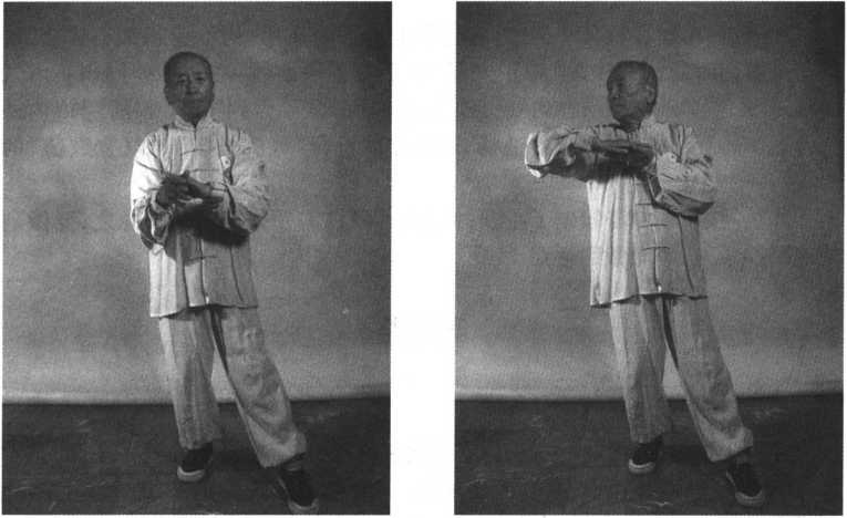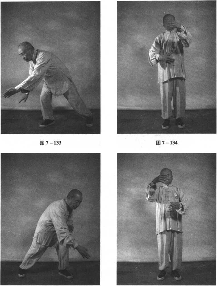 身体左转面向东南,左手左下摆至左胯。右手向左前下穿掌;右脚向左脚 靠拢(见图7 -139);右掌抽回胸前高与肩平,掌心向里;左手弧形回至腹前,掌 心向里。右手在上,左手在下,两臂撑圆,脊背后倚,内气鼓荡(见图7 - 140)。