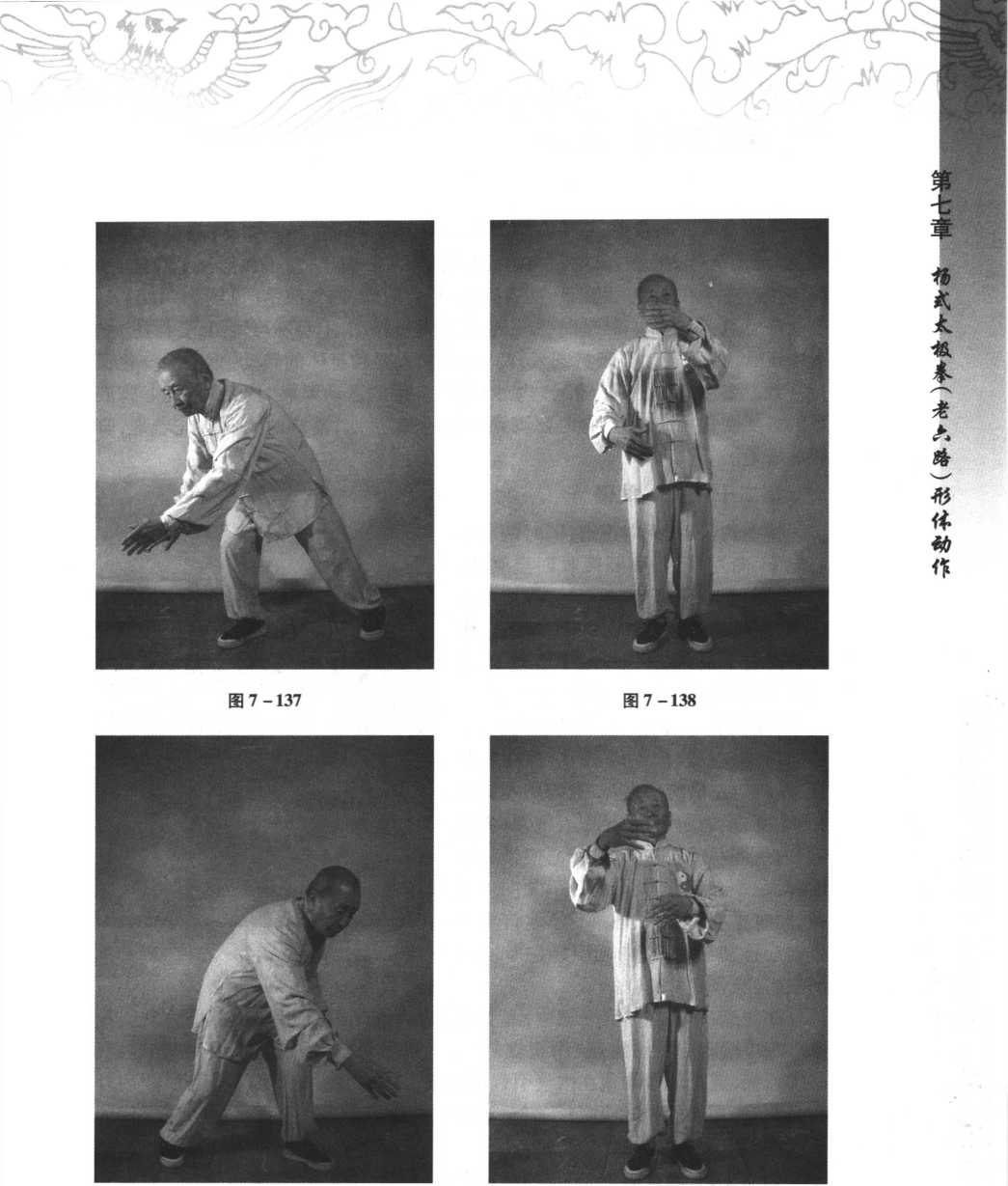 (见图 7-130)。(见图 7-130)。脚随左脚内扣45度,至面向正东,足跟着地,脚尖翘起(见图7 - 129),内劲催 左臂向左平贴,重心慢慢移至前脚,左手心翻转向下,内劲引领向下沉採,同时 重心移至后腿。不停止地将重心再向前移动至前腿,内劲引领左掌心向前按出