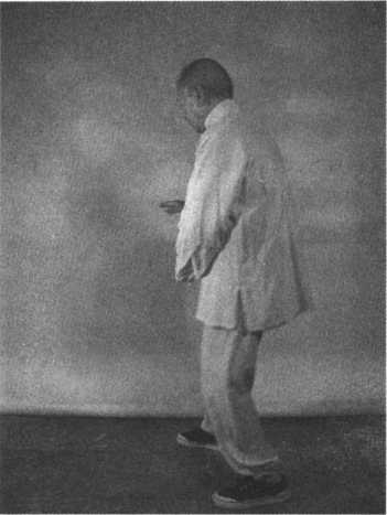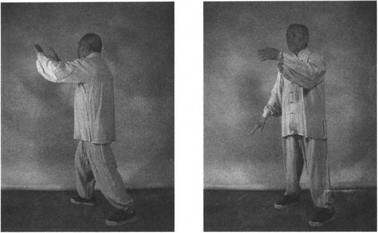 按。两手手心均转向内,两手分开,中间留有一手掌距离(见图7 -222), 两手心均翻转向下,垂直下按,身体后撤,两手随身体后撤,向腹前回收(见图 7 - 223 ),两手心好似扶在箱子盖上,然后内劲送达手指,好像在掀箱子盖,内劲 催促两手向前上按出,重心移于右腿(见图7 -224)。