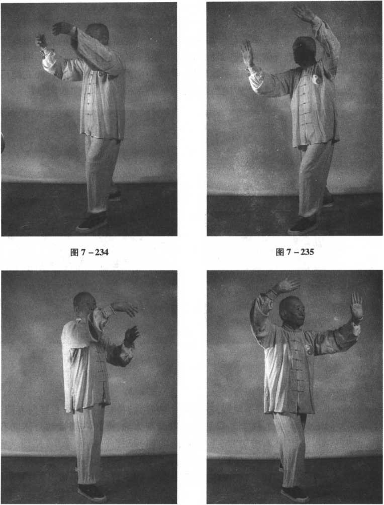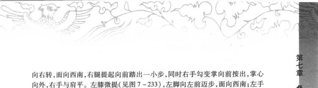 经胸前向右上画弧上棚,掌心翻转向里,右手外旋掌心翻转向里,两臂弧形向外 撑圆,高与肩平。上身微向前倾,眼神平视西南方(见图7-234)。中指引领左 手掌上升,在左手超过头部时,手腕旋转,使掌心向外于额前。同时,伸右腿弓 左膝,身体前移,右掌由胸正中向西南按去(见图7 -235)。面向西南角。经胸前向右上画弧上棚,掌心翻转向里,右手外旋掌心翻转向里,两臂弧形向外 撑圆,高与肩平。上身微向前倾,眼神平视西南方(见图7-234)。中指引领左 手掌上升,在左手超过头部时,手腕旋转,使掌心向外于额前。同时,伸右腿弓 左膝,身体前移,右掌由胸正中向西南按去(见图7 -235)。面向西南角。式太報S式太報S图 7 -232图 7 -232图 7-233图 7-233