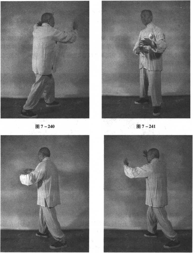 接上式,腰胯后坐,双手后捋,左脚尖扣转向北,身稍左转,重心移向左腿, 右手向左斜下舒伸,掌心向上左脚站稳后以脚跟为轴,提起右脚带动身体向左 转,面向西北,右脚向西北迈一步,上身微向前倾,眼神平视西北方(见图7 - 241)。中指引领右手掌上升,在右手超过头部时,手腕旋转,使掌心向外于额 前。同时,伸左腿弓右膝,身体前移,左掌由胸正中向西北按去(见图7 -242)。 面向西北角,此为穿梭的第四个角(见图7 -243)。