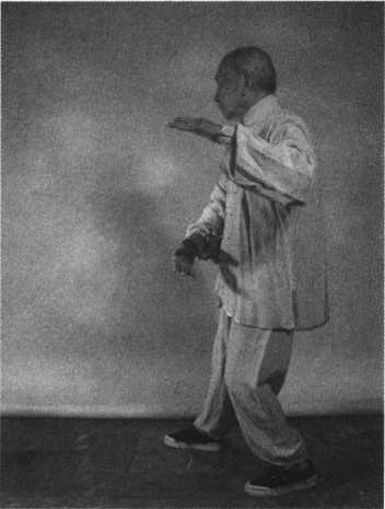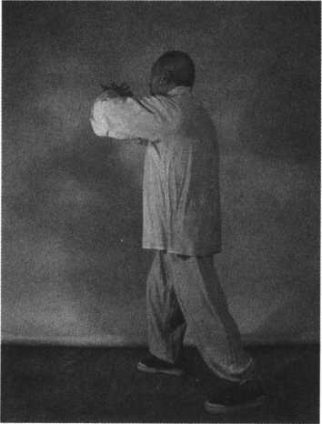 棚。右腿抬起,右脚向右偏转,身体同时向右转,面向正西。随转体重心慢 慢移于右腿,右腿屈膝微蹲,同时以右臂向右上画弧棚出,意念随右臂上棚,眼 神注视右臂(见图7 -246)。