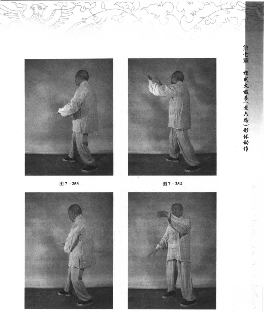NEIGONfGJIEMI YAJNTGSHI TAalQPANrAOUULUNEIGONfGJIEMI YAJNTGSHI TAalQPANrAOUULU接上式,身体向东南转动,转动的步 骤是:先向左回首看,眼神领先,接着右 腿渐伸,左膝微屈,腰胯随之边后坐,边 左转带动右脚尖内扣,转向正南,两手掌 向下,随腰胯向左平抹(见图7 -258), 图7-257