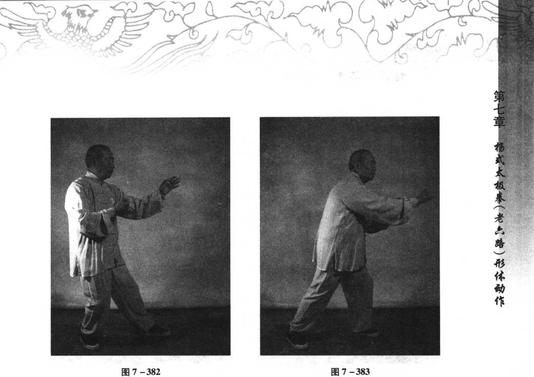 右腿弯曲,重心渐渐移向右腿。同时,左掌经右肘下向右外伸,并沿右臂向 前,随伸随着臂外旋,使掌心翻转朝里,右拳变掌,沉平,指尖朝上,两臂交叉,右 臂在里,眼神观注两掌。重心继续后移,后腿坐实,两掌向左右分开,稍窄于肩, 随分随着两臂内旋使掌心朝下,两掌上抬掌根与肩同高,重心渐渐前移,弓左 膝,蹬右腿,成左弓步;同时两掌向前按出,掌心向前,指尖朝上,眼向前平远视 (见图 7 -384、图 7 -385)。