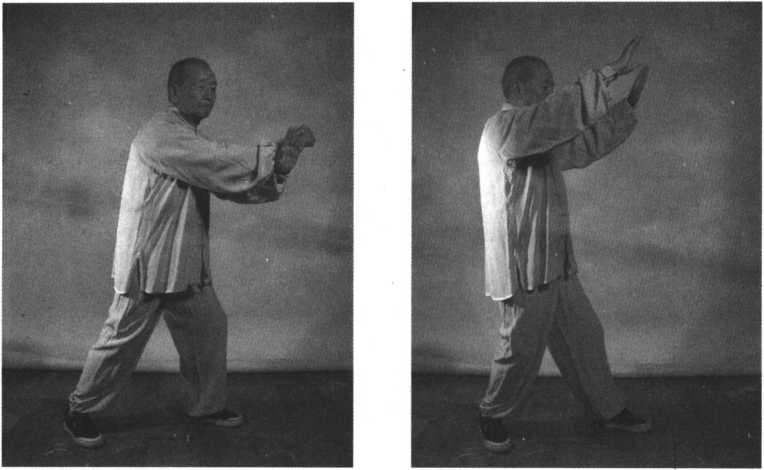 注意点:左脚尖里扣踏实时,右脚跟随,即渐渐离地提起开步;当右脚落实 时,左脚提起向右脚靠拢,这也是步法中分清虚实及阴阳变化的要求。整个十 字手的动作要求,要“上下相随,内外相合”。两臂成环状,不可端肩抬肘;两腿 直立时,全身都要放松。