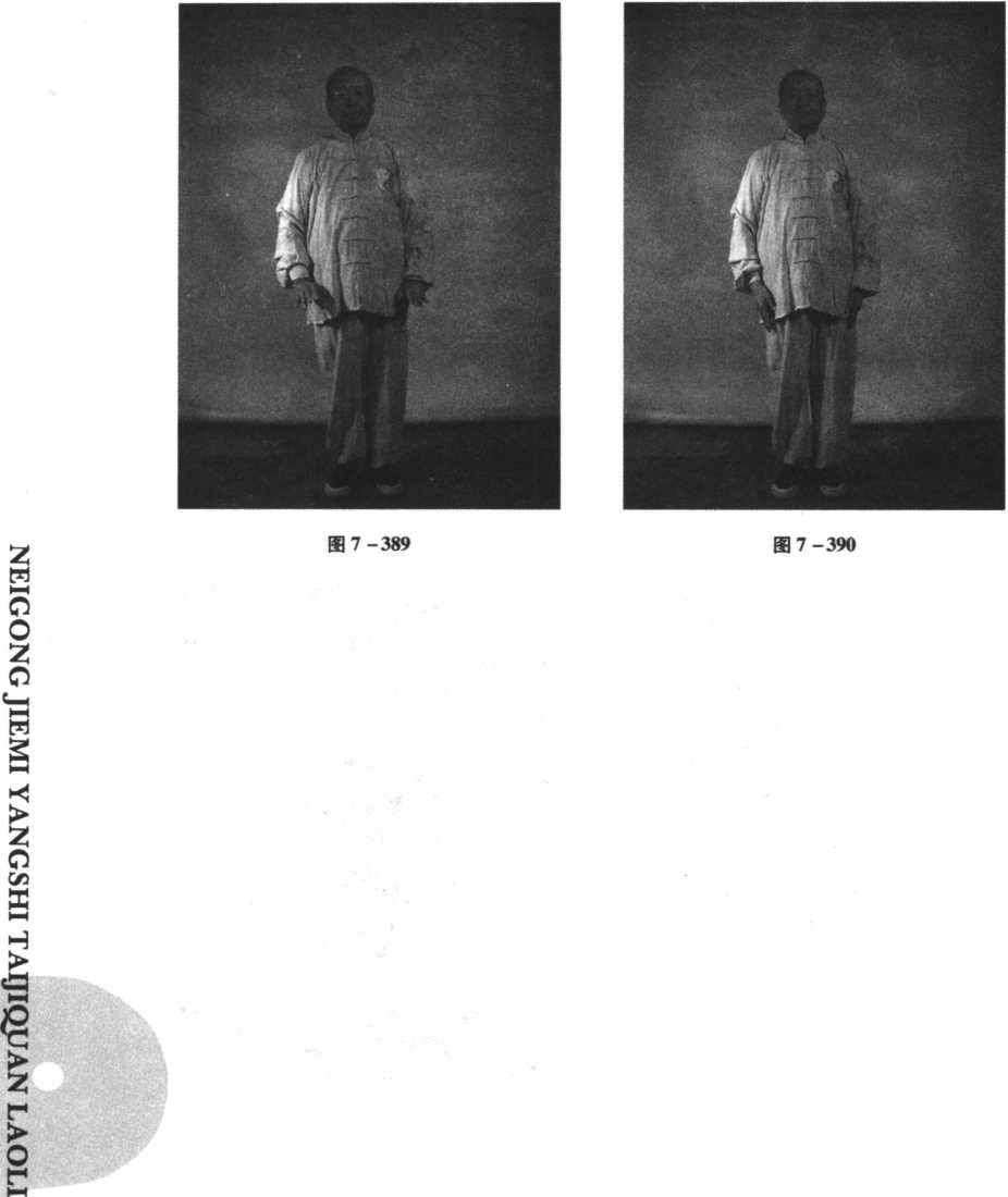 两脚缓缓蹬起,转腕使双手手心转 向前,然后缓缓向前下按,腰背微微后 倚,似凭栏下望。再向下按落于胯前,随 即自然地垂于跨两侧;眼神自然地向内 收敛(见图7 - 388、图7 - 389、图7 - 390) 〇