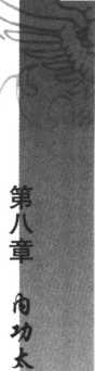1. 棚劲。两脚并齐,右手前伸,掌心向前,大拇指盖对右鼻孔,然后手心翻 转向内(以大拇指为轴)提左手,大栂指对前心口窝和右肘尖,屈膝出步(右步) 同时右掌翻转向前,想命门往右胯上合,两手的位置不变,不要用力,做完后,右 手心放在右阳陵穴,有将自己端起来的意念,立身双手提到环跳后放下(见 图8-70)。