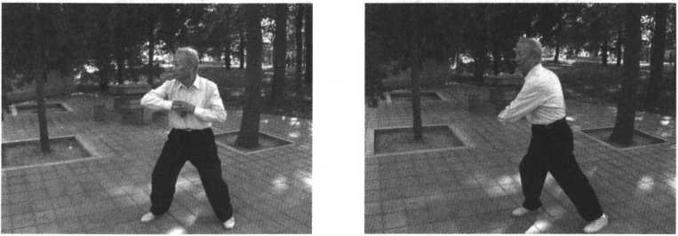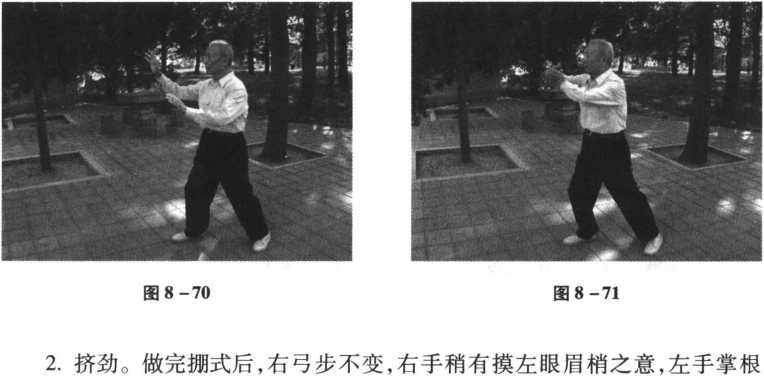 四个劲可以单独练习,打棚劲时,大拇指对鼻尖,手心翻转,另一只手上来 对心窝和肘尖,弓膝出步对翻掌,收式时前后合着阳陵穴,后脚跟上,两手合着 两阳陵穴想给自己抱起来似的,立身两手摸环跳,然后放下。打挤劲时,右手意 思是找自己左眉攒左手掌根搭在右腕内,上步用夹脊推着前脚往下落,收式时 将两手分开后脚跟上来,两手横开放下。打肘的收式与棚的收式相同。棚和挤 出步都是正步。挤出去一定脚要在两手中间,肘出去必须肘尖、手尖和脚尖在 一条直线上,是一个直穿步,靠是摆(见图8-73)。