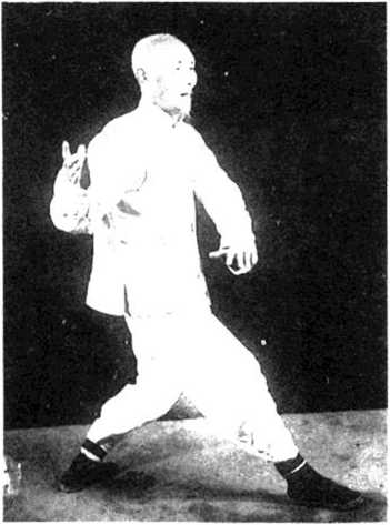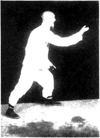 2-同时腰胯向前移动,重心再移回右腿,左腿变虚 随即提起左脚,向前直上一步,腰胯稍向左旋转,左手 随腰圆转而下,由右往左搂过双膝,探于左膝侧,右手 由右后向上圆转.手心向前经右耳边向前按出,左腿屈 膝成左弓蹬步。眼视右手前方,面向正东(图43)。
