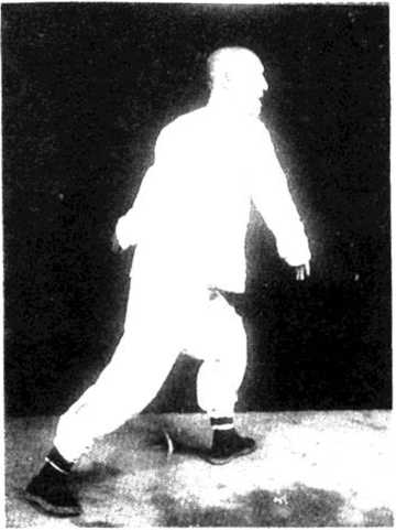 2. 同时右手随腰折 叠,转至左肋翻腕握拳。 左手由下往左后圆转,手 心转为斜向前。身躯向前 移动,重心随移于左脚, 随即提起右脚向前偏左 上一步,脚根先着地,落