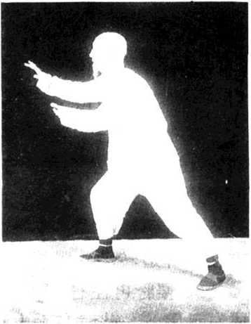 抱虎归山是两面对打法。对方右侧斜进攻,我即两 手分开,用右手由上接粘,用左掌击面。如有人从左侧 击来,我急转腰胯踏出右步,以右手搂开对方进攻,同 时左掌击出;如对方坐腿避开,我右手又到,连环击出。