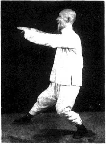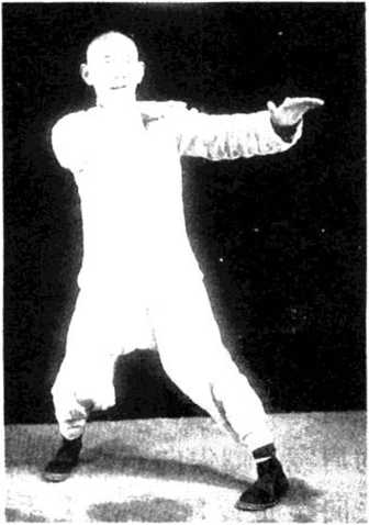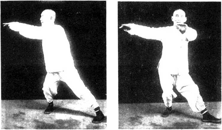 1. 两手由十字边分边向右后迈右步.右手搂过右 膝,左手圆转从耳边向前按。这3个动作要连续进行。