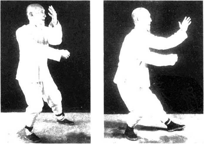 该式是连环三手,比如我先以右手击对方太阳穴, 若对方以左手由外迎隔,我便拗回右手,藏于左肘之下, 但左掌随即向对方面部击出。若对方又迎隔我左掌,则 我右拳由左肘下出击对方胸部,此三手必有一中。