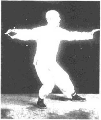 2. 右脚向左前上步时,向东南迈步,右脚落处与左 脚距离肩宽,右脚尖向东南,与左脚形成45。。