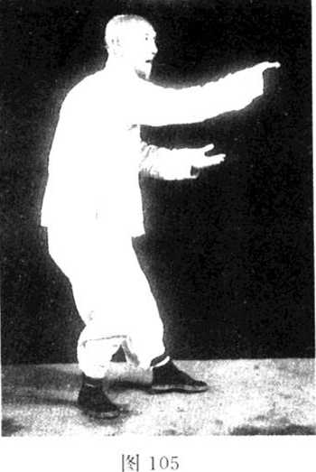 1. 两手沉肩坠肘,随腰胯向右旋转。右手在上、左 手在卜L旋转到尽处。眼视转动前方(图106)。