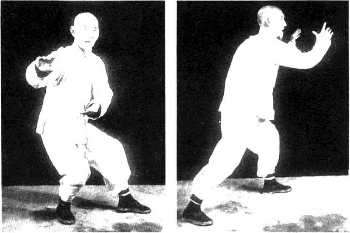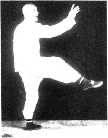 是上以手应,下以脚随,此种手脚齐发打法,可使 对方不能上下兼顾,对方以右手击来,则急进左步以两 手顺其来势粘走,或以左手接住其腕,用右臂拢其肘,同 时起右脚,踢其腹部。