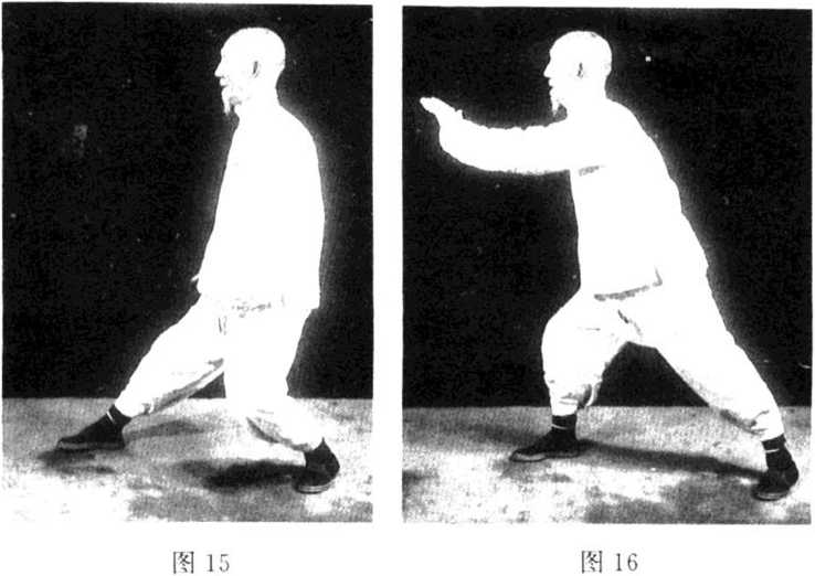 三、按势。接探势,随腰胯往前转动,两手圆转略提, 随腰胯一齐,沉肩坠肘地向前按出,按到尽处时,坐手 腕,重心移于右腿,成右弓蹬步。眼随双手向前平视 (图 16)0|牛春明太极拳