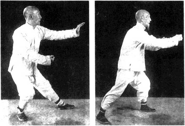 1-随腰胯右转时右脚尖向右开45。,重心向前移、落 在右脚,上左脚同时左掌迎面扑出。眼视左掌前方(图 127)。