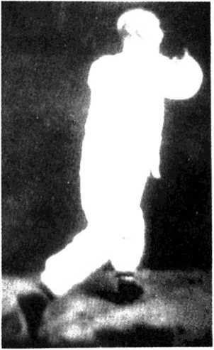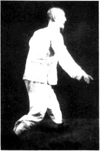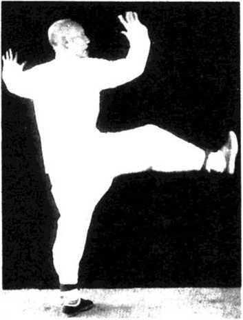 3. 图131图131提起右脚向前 蹬出,脚心向外,脚尖翘 起,两手随之左右分开, 配合蹬脚之势。面向东, 眼视右脚蹬出之方向 (图 131)。